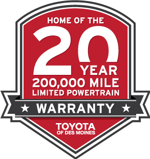 - Toyota of Des Moines has a free 20-year/200,000-mile warranty that applies to all brand-new Toyota cars on our lot!